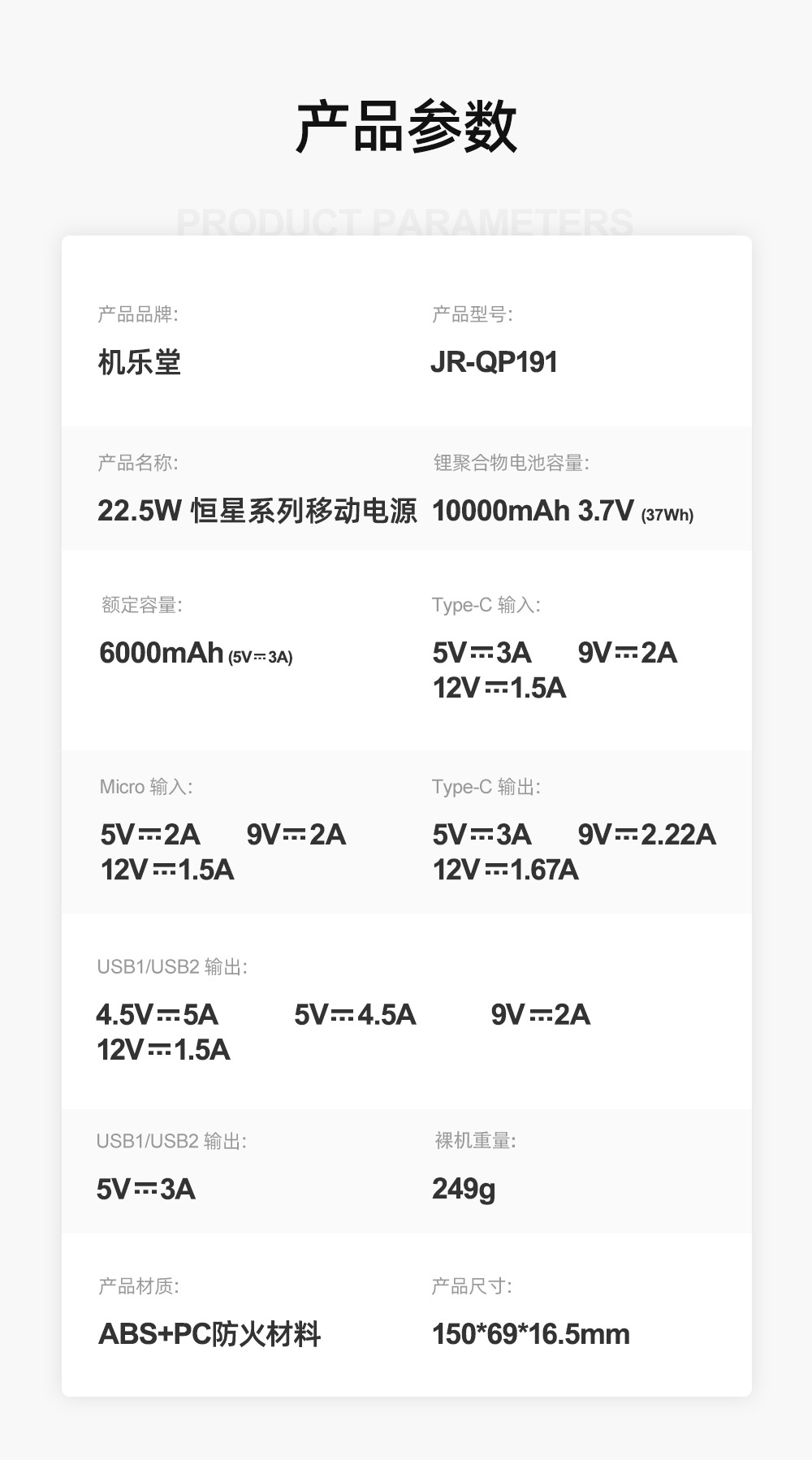 22.5W супер быстрое зарядное устройство, емкость литий-полимерного аккумулятора: 10000mAh, номинальная емкость: 6000mAh (5v3A). Большой цифровой дисплей, мониторинг оставшейся мощности в реальном времени для удовлетворения трех устройств в то же время быстрой зарядки, совместимый с различными протоколами, чтобы адаптироваться к Apple / просо / Samsung быстрой зарядки. Защита от короткого замыкания, температурная защита, защита от перенапряжения, защита от перегрузки по току, защита от переразряда.